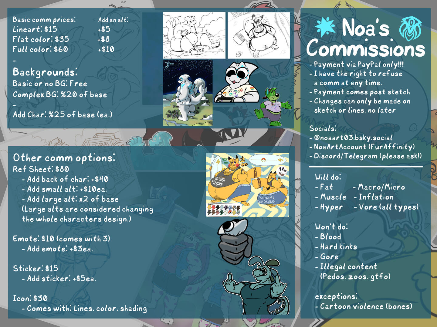 Price, guidelines are posted below the image here, or will be specified in a social post.